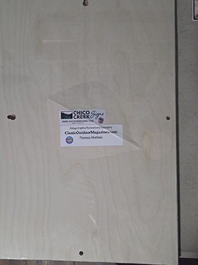 Please add ClassicOutdoorMagazines/MadeInMontana label to the back of wood sings. Use a shape knife to cut a flap in the back and stick my label on the wood below the print shop's label.